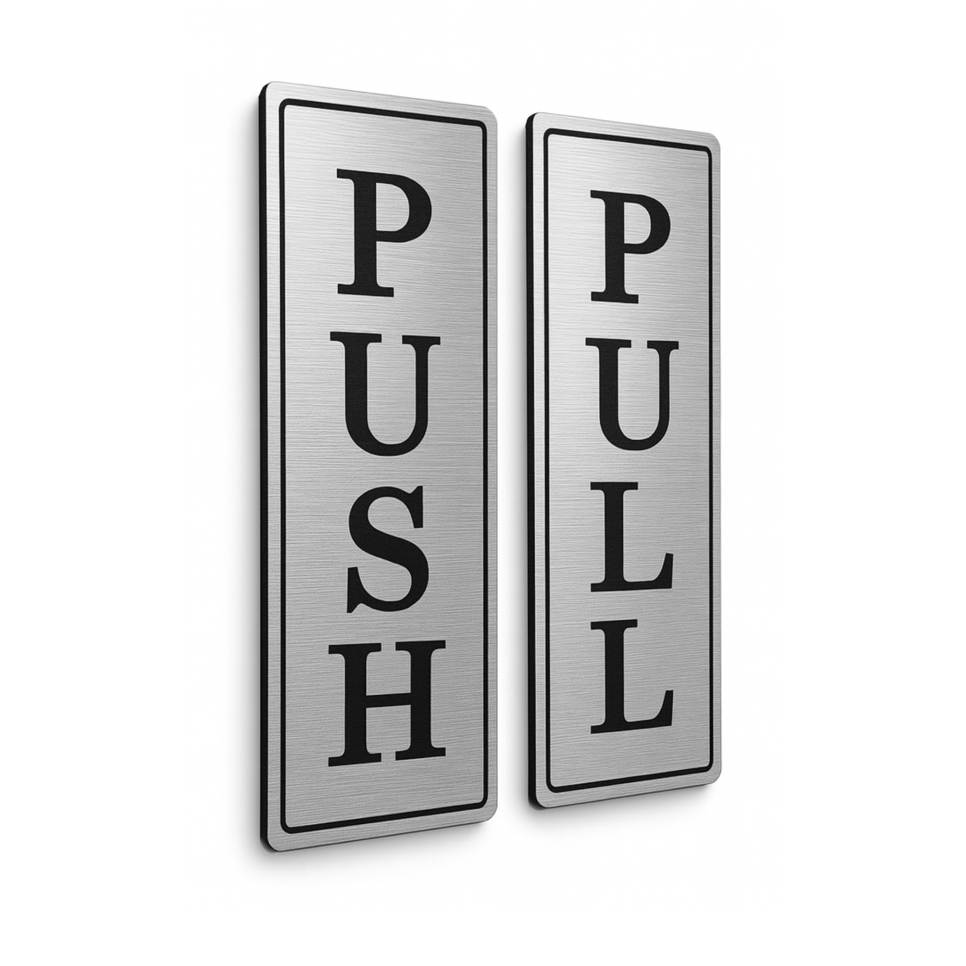 * PUSH PULL SIGNS - laser engraved acrylic sign with adhesive backing.